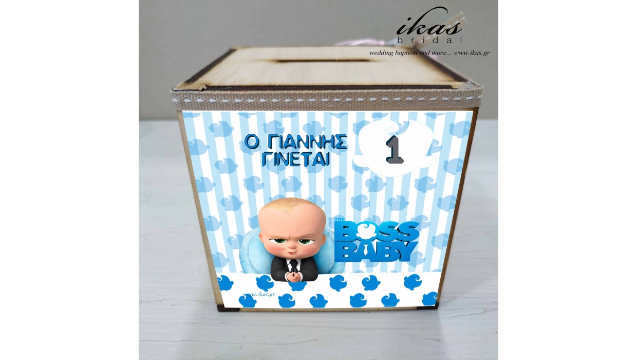 Ξύλινος κουμπαράς με decoupage αρχηγός από κούνια. Στολισμένος με κορδέλα, με άνοιγμα στην πάνω πλευρά για τα κέρματα και τα χαρτονομίσματα και χαραγμένο οβάλ στην κάτω πλευρά για να σπάσει και να βγουν τα χρήματα. Αν επιθυμείτε να μπει και το όνομα του παιδιού ή και η ηλικία του συμπληρώστε το αντίστοιχο πεδίο. Η αρχική τιμή αφορά το προϊόν χωρίς κουφέτα, τούλι και κορδέλες. Μπορεί να συνδυαστεί με σιελ κορδέλα, σιελ τουλάκι και κουφέτα Χατζηγιαννάκη και να γίνει μια εντυπωσιακή μπομπονιέρα βάπτισης. Στην περίπτωση που θέλετε την μπομπονιέρα με κουφέτα έτοιμη δεμένη κάντε τσεκ το αντίστοιχο κουτάκι στις επιλογές μπομπονιέρας. Αν επιθυμείτε διαφορετικά χρώματα στην κορδέλα ή στο τουλάκι συμπληρώστε τα χρώματα που θέλετε στο πεδίο σχόλια. Για δημιουργία διαφορετικού θέματος, αλλαγή στη γεύση του κουφέτου ή αλλαγή στην ημερομηνία παράδοσης επικοινωνήστε μαζί μας για να δούμε αν μπορούμε να ανταπεξέλθουμε.