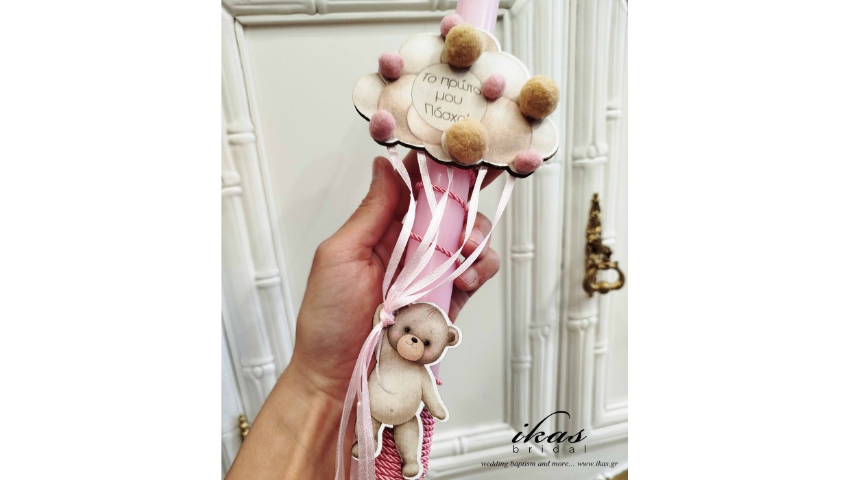 Χειροποίητη πασχαλινή λαμπάδα αρκουδάκι με μπαλόνια και το κείμενο " Το πρώτο μου Πάσχα!". Στολισμένη με κορδέλες. Υπέροχη λαμπάδα για το βαφτιστήρι σας, για την πρώτη του πασχαλινή λαμπάδα. Από τις διαθέσιμες επιλογές διαλέξτε το χρώμα για τις κορδέλες. Για δημιουργία διαφορετικού θέματος ή αλλαγή στην ημερομηνία παράδοσης επικοινωνήστε μαζί μας για να δούμε αν μπορούμε να ανταπεξέλθουμε.