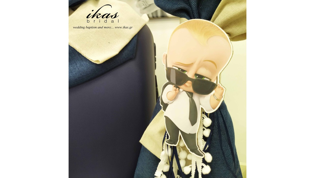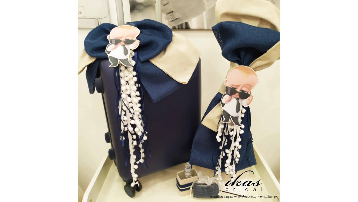 Χειροποίητο πακέτο βάπτισης με τον αρχηγό από κούνια ( baby boss ) για αγόρι. Τροχήλατη μπλε βαλίτσα στολισμένη με μπλε και μπεζ φιόγκους, ξύλινο baby boss και πολλές κορδέλες. Λαμπάδα με μπλε και μπεζ φιόγκους, ξύλινο baby boss και πολλές κορδέλες. Μπουκαλάκι λαδιού στολισμένο με μπλε και μπεζ ύφασμα. Σαπουνάκι τυλιγμένο σε πουγκάκι. Στα "προϊόντα πακέτου βάπτισης" διαλέξτε τα προϊόντα που επιθυμείτε. Για δημιουργία διαφορετικού θέματος, αλλαγή στα χρώματα ή αλλαγή στην ημερομηνία παράδοσης επικοινωνήστε μαζί μας για να δούμε αν μπορούμε να ανταπεξέλθουμε.