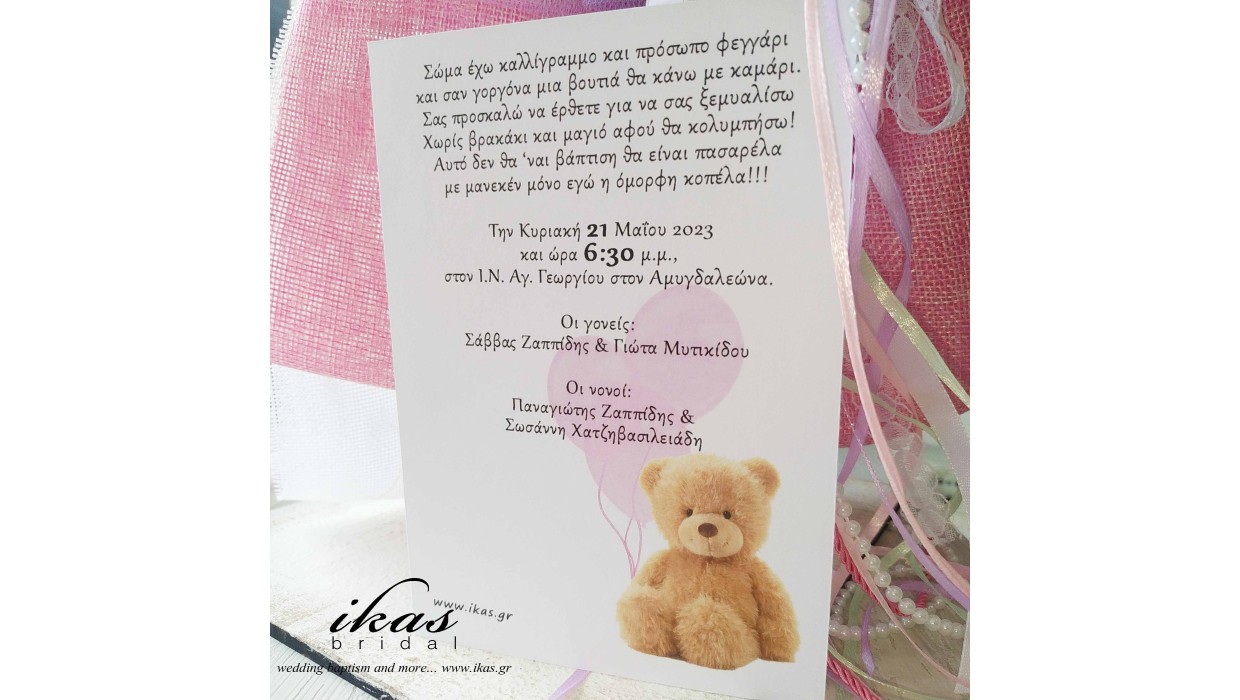 Προσκλητήριο βάπτισης ή πάρτυ αρκουδάκι με μπαλόνια. Από τις επιλογές προσκλητηρίου διαλέξτε αν θέλετε να είναι παπυράκι και να τυπωθεί σε λεπτό μεταλλιζέ χαρτί ώστε να μπορείτε να το κάνετε κύλινδρο και να το δέσετε με την κορδέλα που περιλαμβάνετε, αν θέλετε να είναι κάρτα και να τυπωθεί σε χαρτονάκι ή αν θέλετε να είναι κάρτα με φακελάκι, σε αυτή την περίπτωση διαλέξτε και το χρώμα από το φακελάκι. Συμπληρώστε προσεχτικά όλο το κείμενο του προσκλητηρίου, σε περίπτωση που θέλετε το κείμενο να είναι ίδιο με το δείγμα συμπληρώστε μόνο την ημερομηνία, ώρα, τόπο και τα ονόματα. Πριν την εκτύπωση θα σας στείλουμε το κείμενο στο email σας για τελικό έλεγχο. Για δημιουργία διαφορετικού θέματος ή αλλαγή στην ημερομηνία παράδοσης επικοινωνήστε μαζί μας για να δούμε αν μπορούμε να ανταπεξέλθουμε.