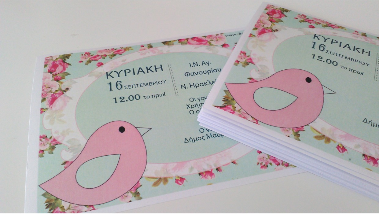Προσκλητήριο βάπτισης ή πάρτυ floral πουλάκι. Από τις επιλογές προσκλητηρίου διαλέξτε αν θέλετε να είναι παπυράκι και να τυπωθεί σε λεπτό μεταλλιζέ χαρτί ώστε να μπορείτε να το κάνετε κύλινδρο και να το δέσετε με την κορδέλα που περιλαμβάνετε, αν θέλετε να είναι κάρτα και να τυπωθεί σε χαρτονάκι ή αν θέλετε να είναι κάρτα με φακελάκι, σε αυτή την περίπτωση διαλέξτε και το χρώμα από το φακελάκι. Συμπληρώστε προσεχτικά όλο το κείμενο του προσκλητηρίου, σε περίπτωση που θέλετε το κείμενο να είναι ίδιο με το δείγμα συμπληρώστε μόνο την ημερομηνία, ώρα, τόπο και τα ονόματα. Πριν την εκτύπωση θα σας στείλουμε το κείμενο στο email σας για τελικό έλεγχο. Για δημιουργία διαφορετικού θέματος ή αλλαγή στην ημερομηνία παράδοσης επικοινωνήστε μαζί μας για να δούμε αν μπορούμε να ανταπεξέλθουμε.