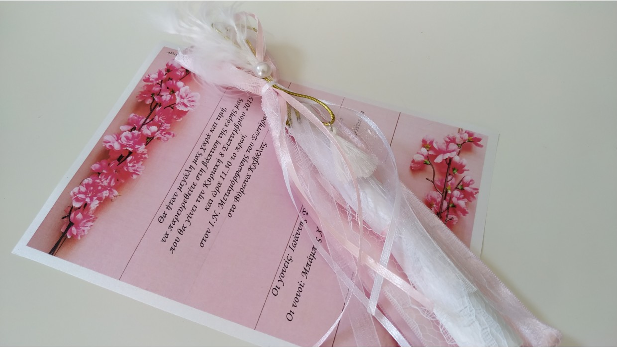 Προσκλητήριο βάπτισης ή γάμου ρομαντικό διαστάσεις ανοιχτό περίπου 14,85*21 εκατοστά, τυλιγμένο σε κορδέλα σατέν - δαντέλα με κορδέλες, φουντίτσα, πούπουλο και πέρλα. Συμπληρώστε προσεχτικά όλο το κείμενο του προσκλητηρίου, σε περίπτωση που θέλετε το κείμενο να είναι ίδιο με το δείγμα συμπληρώστε μόνο την ημερομηνία, ώρα, τόπο και τα ονόματα. Πριν την εκτύπωση θα σας στείλουμε το κείμενο στο email σας για τελικό έλεγχο. Για δημιουργία διαφορετικού θέματος ή αλλαγή στην ημερομηνία παράδοσης επικοινωνήστε μαζί μας για να δούμε αν μπορούμε να ανταπεξέλθουμε.