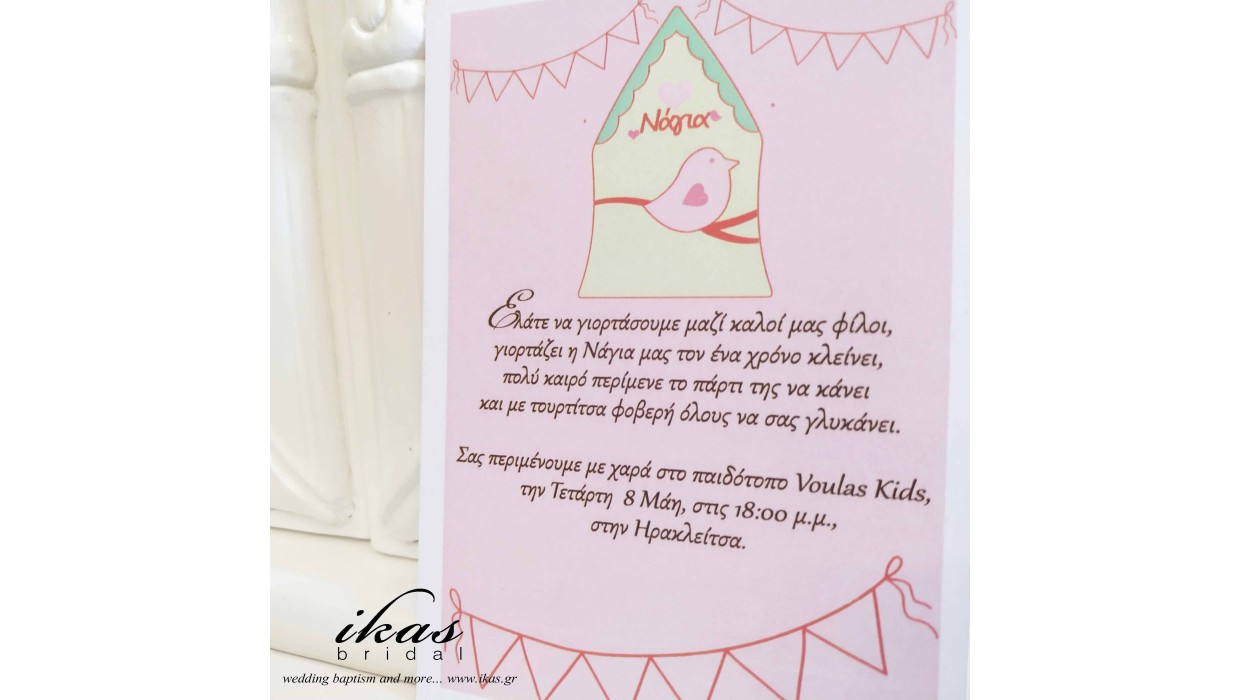 Προσκλητήριο βάπτισης ή πάρτυ με πουλάκι. Από τις επιλογές προσκλητηρίου διαλέξτε αν θέλετε να είναι παπυράκι και να τυπωθεί σε λεπτό μεταλλιζέ χαρτί ώστε να μπορείτε να το κάνετε κύλινδρο και να το δέσετε με την κορδέλα που περιλαμβάνετε, αν θέλετε να είναι κάρτα και να τυπωθεί σε χαρτονάκι ή αν θέλετε να είναι κάρτα με φακελάκι, σε αυτή την περίπτωση διαλέξτε και το χρώμα από το φακελάκι. Συμπληρώστε προσεχτικά όλο το κείμενο του προσκλητηρίου, σε περίπτωση που θέλετε το κείμενο να είναι ίδιο με το δείγμα συμπληρώστε μόνο την ημερομηνία, ώρα, τόπο και τα ονόματα. Πριν την εκτύπωση θα σας στείλουμε το κείμενο στο email σας για τελικό έλεγχο. Για δημιουργία διαφορετικού θέματος ή αλλαγή στην ημερομηνία παράδοσης επικοινωνήστε μαζί μας για να δούμε αν μπορούμε να ανταπεξέλθουμε.