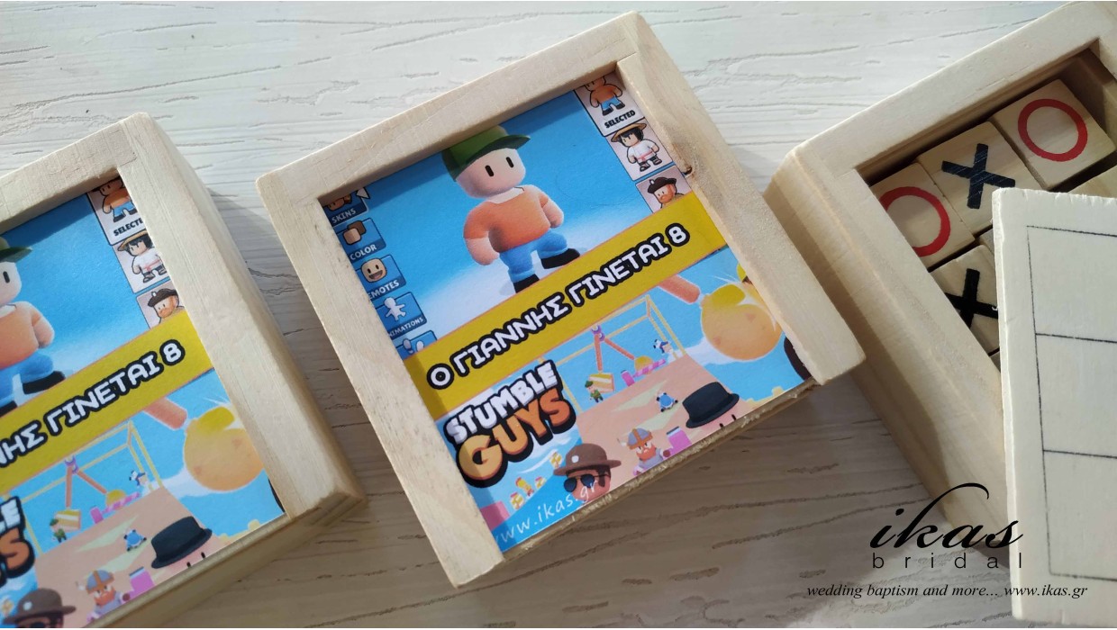 Ξύλινη τρίλιζα με decoupage χαρτονάκι stumble guys, το όνομα του παιδιού και την ηλικία του. Ένα πρωτότυπο ξύλινο παιχνίδι για αναμνηστικό παιδικού πάρτυ. Η αρχική τιμή αφορά το προϊόν χωρίς κουφέτα, τούλι και κορδέλες. Μπορεί να συνδυαστεί με σιελ τουλάκι, τριών χιλιοστών σιελ και άσπρη κορδέλα και κουφέτα Χατζηγιαννάκη και να γίνει μια εντυπωσιακή μπομπονιέρα βάπτισης. Σε αυτή την περίπτωση γράψτε μόνο το όνομα του παιδιού χωρίς την ηλικία του και κάντε τσεκ το αντίστοιχο κουτάκι στις επιλογές μπομπονιέρας (οι μπομπονιέρες θα σας αποσταλούν δεμένες). Αν επιθυμείτε διαφορετικά χρώματα στην κορδέλα ή στο τουλάκι συμπληρώστε τα χρώματα που θέλετε στο πεδίο σχόλια. Για δημιουργία διαφορετικού θέματος, αλλαγή στη γεύση του κουφέτου ή αλλαγή στην ημερομηνία παράδοσης επικοινωνήστε μαζί μας για να δούμε αν μπορούμε να ανταπεξέλθουμε.
